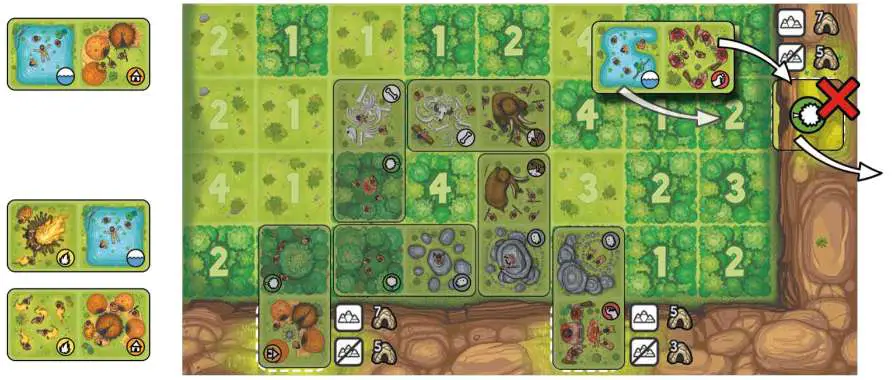 Choose a tile in your Personal Pool and lay it down on a square (Forest, Plain, and/or Cave) still free of any Tribe tile or Bear token. You must also respect the following rules: