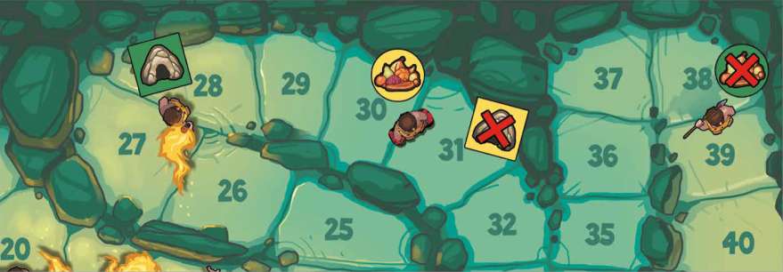 Next, the first player takes the Mountain token for his starting Cave. He scores the higher number of Shelter Points indicated next to this Cave, by moving his Shelter Points token on the Scoretrack.