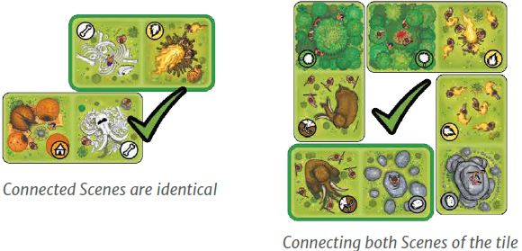 When you play a tile, each of its Scenes connected to one or more tiles already in play earns you Food Points. Advance your Food Points token on the Sco- retrack as many spaces as the value indicated on the Square that this Scene covers.