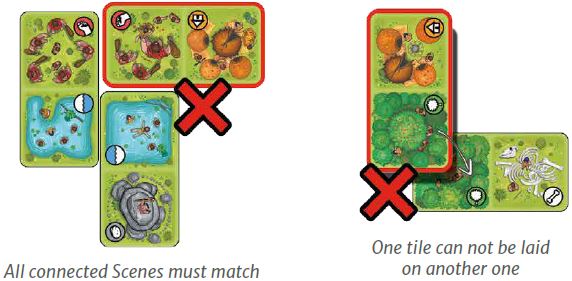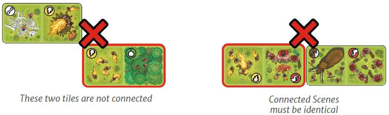 The new tile must be connected to at least one tile already in play. A tile is connected when at least one side (not diagonals) of one of its two Scenes is in contact with another tile.