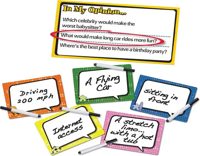 Everyone else writes an answer on their Answer Board and places it face-up on the table as quickly as possible.