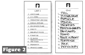 Figure 2 shows an example of a filled- in answer sheet. Players are using List #1 and the letter P was rolled.