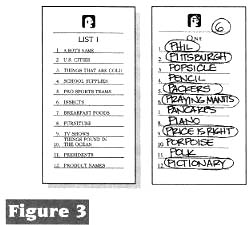Scoring the round: Players, in turn, read their answers aloud. Players mark their own answer sheets by circling acceptable answers that do not match any other player's answers. Continue reading answers until all 12 categories have been marked. Then score 1 point for each of your circled answers. Record your score at the top of the column on your answer sheet, as shown in Figure 3.