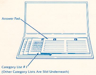 To start a new game, remove the category card in your folder and turn it around. Then Insert It Into the folder again with a new category list faceup. If both lists on one side of the card have been used, flip the card over and use the lists on the back. Make sure all players are using the same List #.