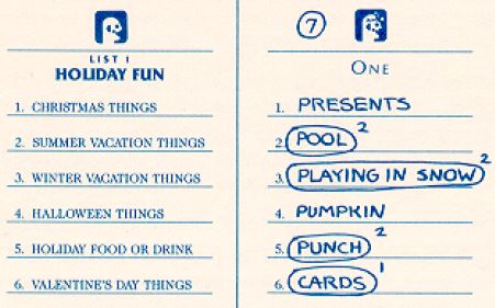 You cannot use the same answer twice in one round. For example: If you write Hot Dog for Picnic Things, you cannot write Hot Dog again for Things at a Baseball Game.