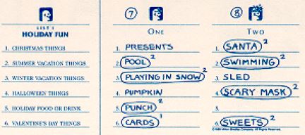 After 2 rounds have been played, all players add up the circled scores on the tops of their answer sheets. The player with the highest score wins!