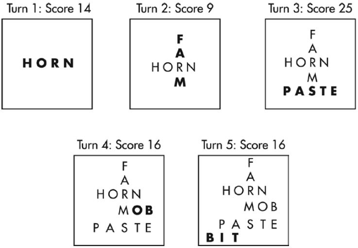 Examples of word formation and scoring: In the following examples, the words or letters added on five successive turns are shown in bold type.