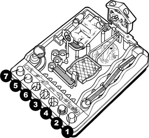 1to rock the ball across the tilting walkway. At the end of the walkway, push the button down gently to place the ball on the end platform.Gently turn dial