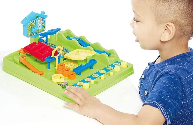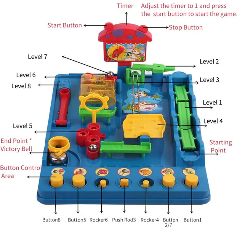 5to bounce the ball up each level and finally through the vertical hoop and onto the blind maze.Turn lever