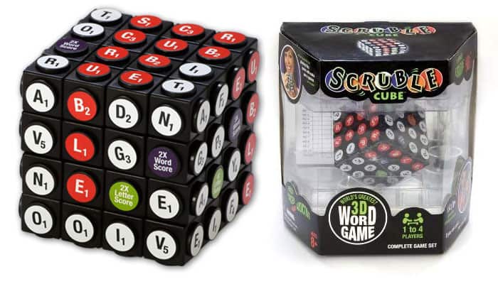 In SCRUBLE Cube, players form words on the cube using letter pegs of different values.
