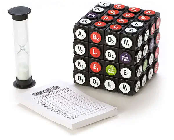 In SCRUBLE Cube, players form words on the cube using letter pegs of different values.