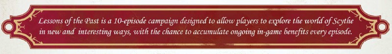 Lessons of the Past is a multiplayer campaign designed to explore the post-Great War world of Scythe. This campaign has some light Legacy elements, and so it is recommended that players play as the same faction throughout, although the ongoing effects of the game impact the factions and not the players.