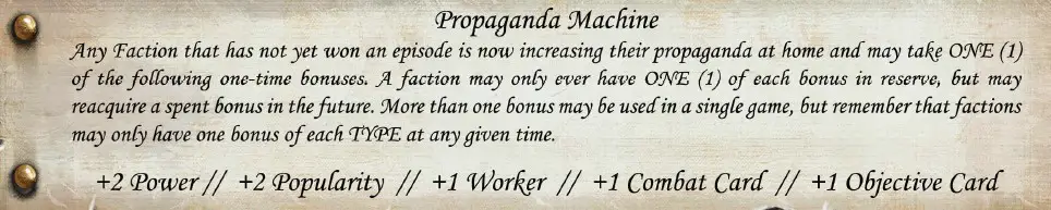 Each episode awards the victor and/or players who accomplish defined goals with powerful ongoing bonuses. In order to track and recall these bonuses during future games, please log them on the Episode Rewards Sheet. These bonuses can be powerful, and allowing one player to accumulate multiple rewards early on is dangerous.