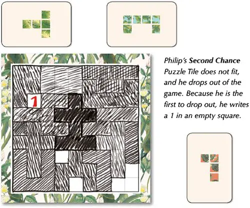 If you cannot draw the Second Chance Puzzle Tile, you drop out from the current game. Multiple players can drop out in the same round. The players who drop out first in each game, write the number 1 as a bonus into an empty square.