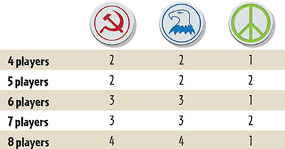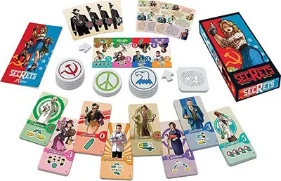 Secrets is a secret identity game. The action takes place in the 1960s. Players are either members of the CIA or KGB, or Hippies. Team affiliations can sometimes change during the game and must always be kept secret.