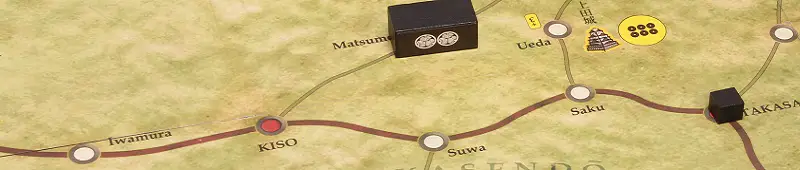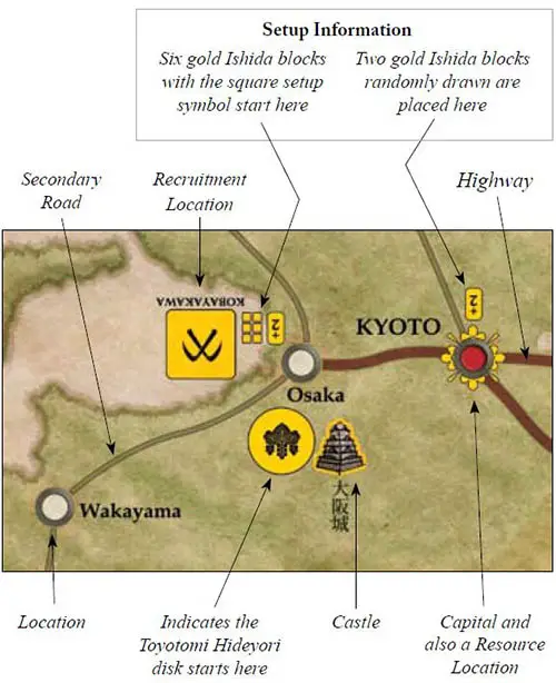 Two Locations, Kyoto and Edo, are capitals. They begin the game affiliated with Ishida and Tokugawa, respectively, and are framed in corresponding color. Capitals are Resource Locations and supply a Leadership Movement Bonus.