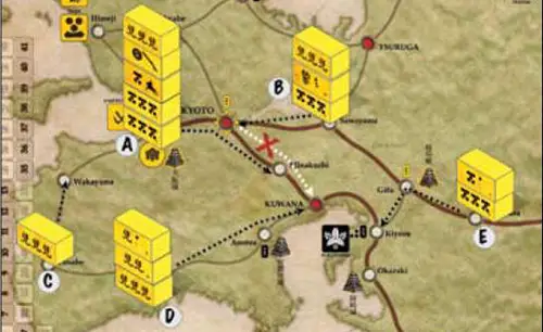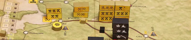 Board: The board represents central Honshu, the largest island of Japan, where the majority of the fighting took place. The board contains the map and the locations in play, the Impact track, the Turn Track, and the Recruitment Boxes.