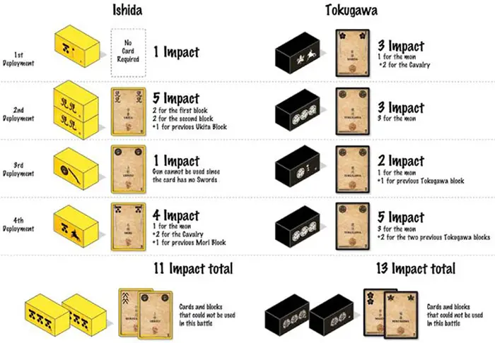 Example: A player would score four Impact if he deployed a 2-mon Tokugawa block into a battle in which he had previously deployed two other Tokugawa blocks (the number of mon on the previously deployed blocks has no effect).