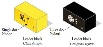 Some blocks represent a daimyo (leader). These are marked with a nobori (banner). Most nobori have a single dot, but the protago- nists of the campaign, Ishida Mitsunari and Tokugawa Ieyasu, are marked with nobori of three dots.