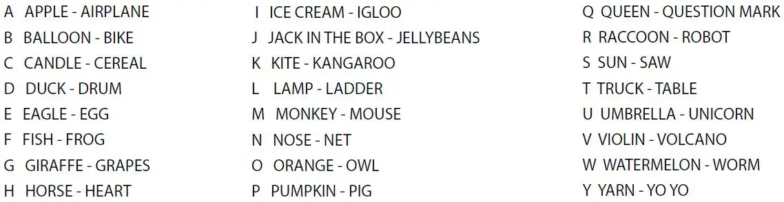 The color on the card must match the colored square by the picture on the board.. For each letter, there are two pictures on the gameboard that start with the same letter (See ALPHABET GUIDE below).