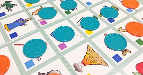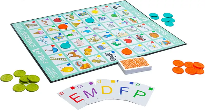 Sounding out the letter on that card, the player then places one of their chips on a picture on the game board whose name starts with the same letter that is on the card.