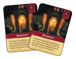 The Summon card immediately exhausts 1 Ability card (of any one Adventurer on Watch) when it is revealed then goes to the Graveyard and is replaced with the card on the top of the Unhallowed deck.