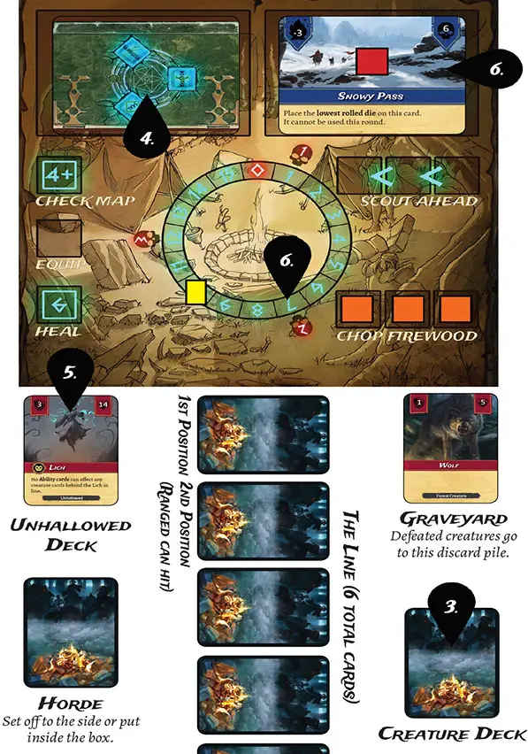 Once a Creature is revealed, it stays revealed even if the firewood value decreases enough to affect the number revealed. Players then use their dice and Adventurer Ability cards to send Creatures to the Graveyard.