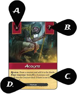 Creature cards describe the abilities and health of each Creature. When Creatures are defeated they go to the Graveyard, when they are not defeated they end up in the Horde.