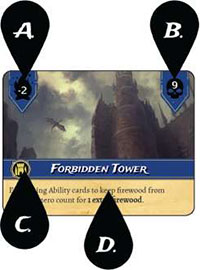 When a round is completed, draw and reveal the next location. Locations determine how much firewood is removed or added to the campfire A and list how many Creatures will be placed in the Line during Watch B. Locations also have unique effects that takes place during the round D. Clearing a location requires all Creatures in the Line to be either defeated or added to the Horde.