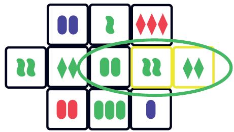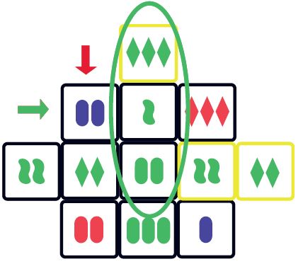 Also notice the two arrows pointing to the 2 purple ovals. The placement of this die does not make a SET in both directions. This placement is fine, because there is a SET made in at least one direction (horizontally).