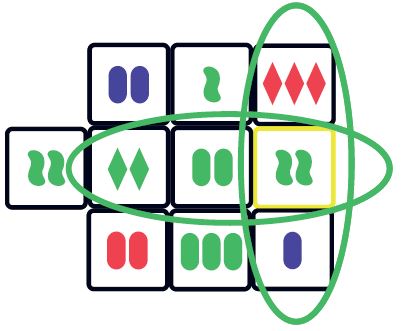 - Number: There are one, two, or three of each symbol on a die. Remember ALL of the features must separately satisfy the rule.