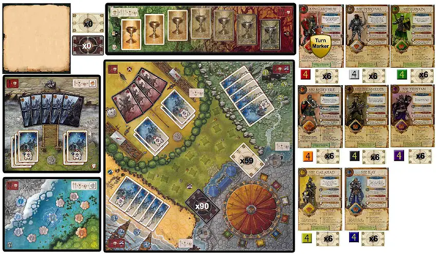 Now place the miniatures of Excalibur, the Holy Grail and Lancelot's Armor on their respective spots on these Quests. Place the 12 Siege Engines, 4 Saxons, 4 Picts and 16 double-sided Swords in a Reserve, next to the gameboard.