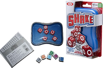 Each player picks a colored die. Place the six Shake dice inside the case. Select a scorekeeper and give them the score pad(Note: You will need a pen or pencil).