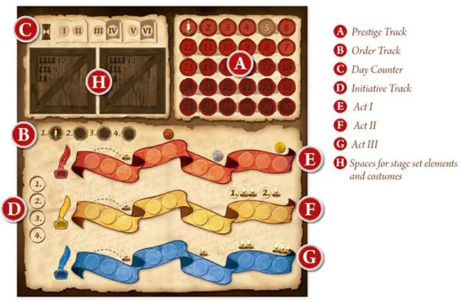 Act III (blue) : each player on one of the three first spaces loses a Prestige point. Each player who reaches the sixth space gains 1 Prestige point. Each player who reaches the eighth space gains 2 Prestige points. Each player who reaches the last spaces gains 3 Prestige points.