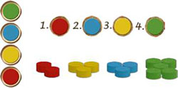 The players reveal their wagers. Red has wagered 2 cylinders, Green 5, while Blue and Yellow have both wagered 3. Red is therefore first. They take the first place and score 1 Prestige point.