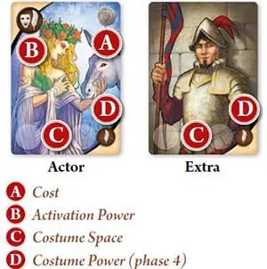 All Character cards showing a costume space and an activation power are actors. Their function is to make the players progress on the three Acts on the main board, but some also have special powers.