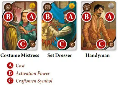 There are three types of craftsmen: costume mistresses, set dressers, and handymen. The craftsmen are identified by a Craftsmen symbol at the bottom right of the card.