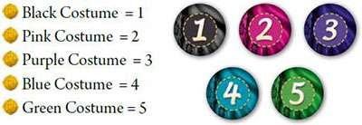 In the other bag, place the Costume elements indicated by the Game Reference card (for example, with 4 players: 16 black, 16 pink, 12 purple, 12 blue, 8 green, 8 yellow).