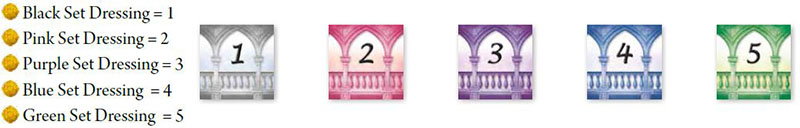 Depending on the value of their set dresser (6 or 8), the player takes set dressing elements from among those available for the day and places them on their set. The values of the elements are as follows: