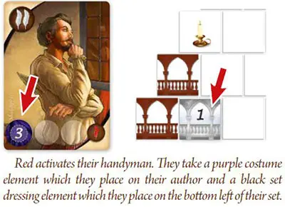 The handyman works as both a set dresser and a costume mistress at once. When activated he thus takes both set dressing and costume elements (non yellow) at once for a maximum total value of 4 and places them following the same rules for placement as explained earlier (it's of course possible to take only set dressing elements or costumes).