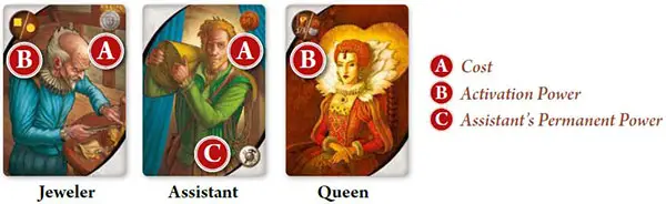 The assistant cannot be activated (no cylinders can be placed on it). He grants a permanent power to the player: for each assistant they own, the value of all of the player's craftsmen are permanently increased by 1.