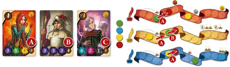 The player placed last on the Order track chooses one of the Character cards previously drawn, and places it next to their individual board. The player preceding them chooses one of the remaining cards and does the same. Proceed in this way until the first player. The remaining cards are discarded.