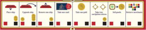 This indicates that you must expend one of your merchant cubes and the amount of gold shown to perform the action. On the right-hand side of each box you will see a free action cube image and possibly some gold coin symbols.