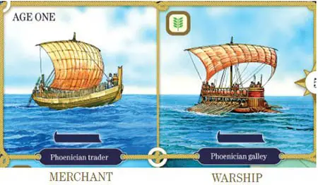 Each ship age is made up of two ship types. One of these is always a merchant vessel, while the other is always a warship. The warship is always the second of the two ship types, and has a food symbol in it. You have to expend one food counter from your warehouse if you wish to place your ship in the Warship box.