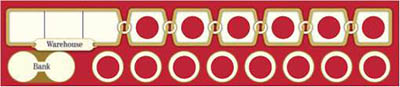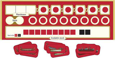 You place one of your city discs each space except for the first three Warehouse spaces and the first two Bank spaces. Separate your ship counters into piles of the same type. Place these below your player display.