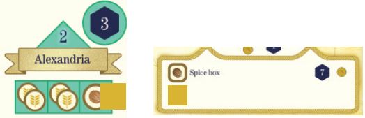 Each area is made up of a number of locations. Each location is made up of a number of trade boxes and one or two city spaces. You must choose one empty trade box in the present area to place your merchant cube in. You then take the goods indicated in that trade box.