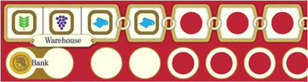 Example: Red decides to sell some of his goods. He chooses to sell two cloth and one wine. He gains eleven gold from this sale. He can retain three of these gold in his bank, as one space is already occupied. He must hand back eight gold, which earns him four victory points.