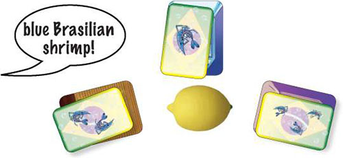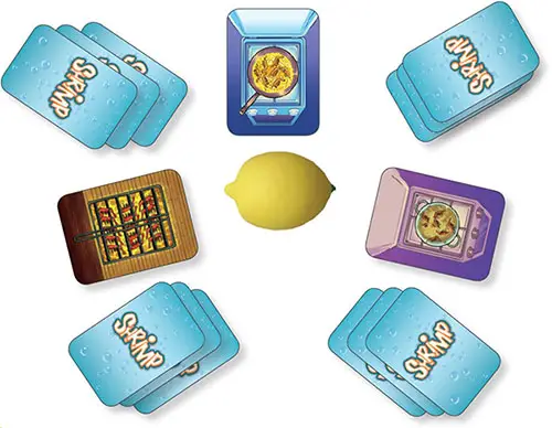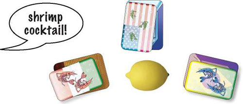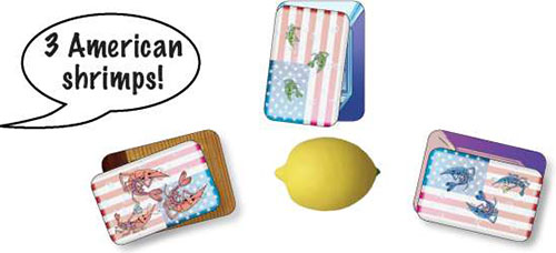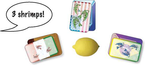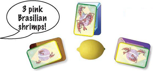 When you notice that the THREE shrimp cards on top of the recipes have ONE common feature, try to be the first to squeeze the lemon (it will make the sound like a squeezed lemon!), calling out the feature that the cards have in common.