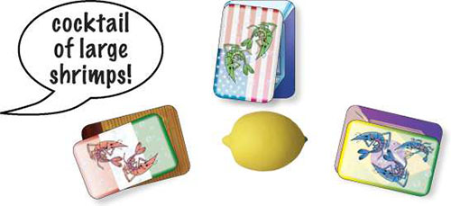 Shrimp lovers know well that seven shrimps are better that one! When the quantity of the visible shrimps on top of the 3 recipes totals SEVEN, if you are the first to squeeze the lemon first and to call out "shrimp cocktail" you claim all the cards, as for a shrimp menu.