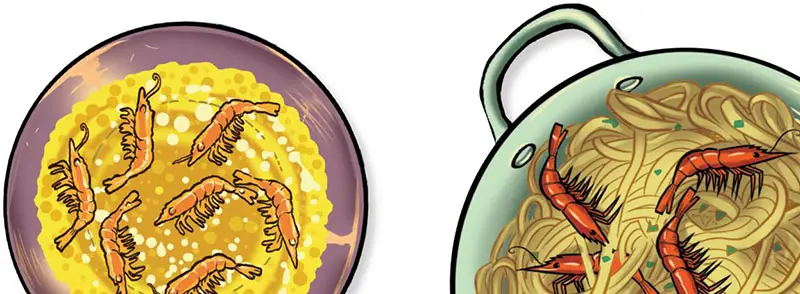 A true cook can never be satisfied with a simple menu or cocktail! If you notice that the shrimp cards on top of the recipes have TWO common features, squeeze the lemon and call out the features: you claim all the cards as usual, plus you take ALSO seven cards from the banquets of other players (from the same player, or from more than one player, as you see fit).